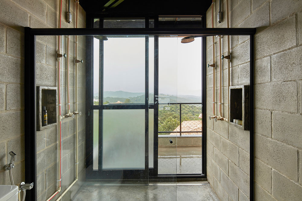 No piso superior, uma passarela metálica corta o pé-direito duplo da sala e conecta as duas suítes que ficam em cada extremo da obra. A que fica ao Norte tem varanda coberta com vista panorâmica para as montanhas.