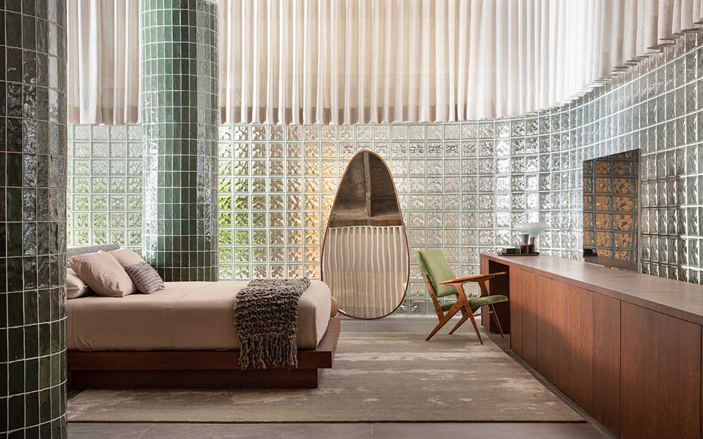 Lá, ela ocupa o mezanino, conhecido por seus brises, e o terraço aberto, que já abrigou o restaurante Fasano. São quase 10 mil metros quadrados para abrigar 30 estúdios e lofts, sete jardins, ilhas de bem-estar, restaurantes, bar e café, banheiros e lojas, além de dois ambientes funcionais, a bilheteria, lounge e espaços para exposições, que buscaram preservar a beleza da estrutura existente, acomodando, ao todo 59 projetos.